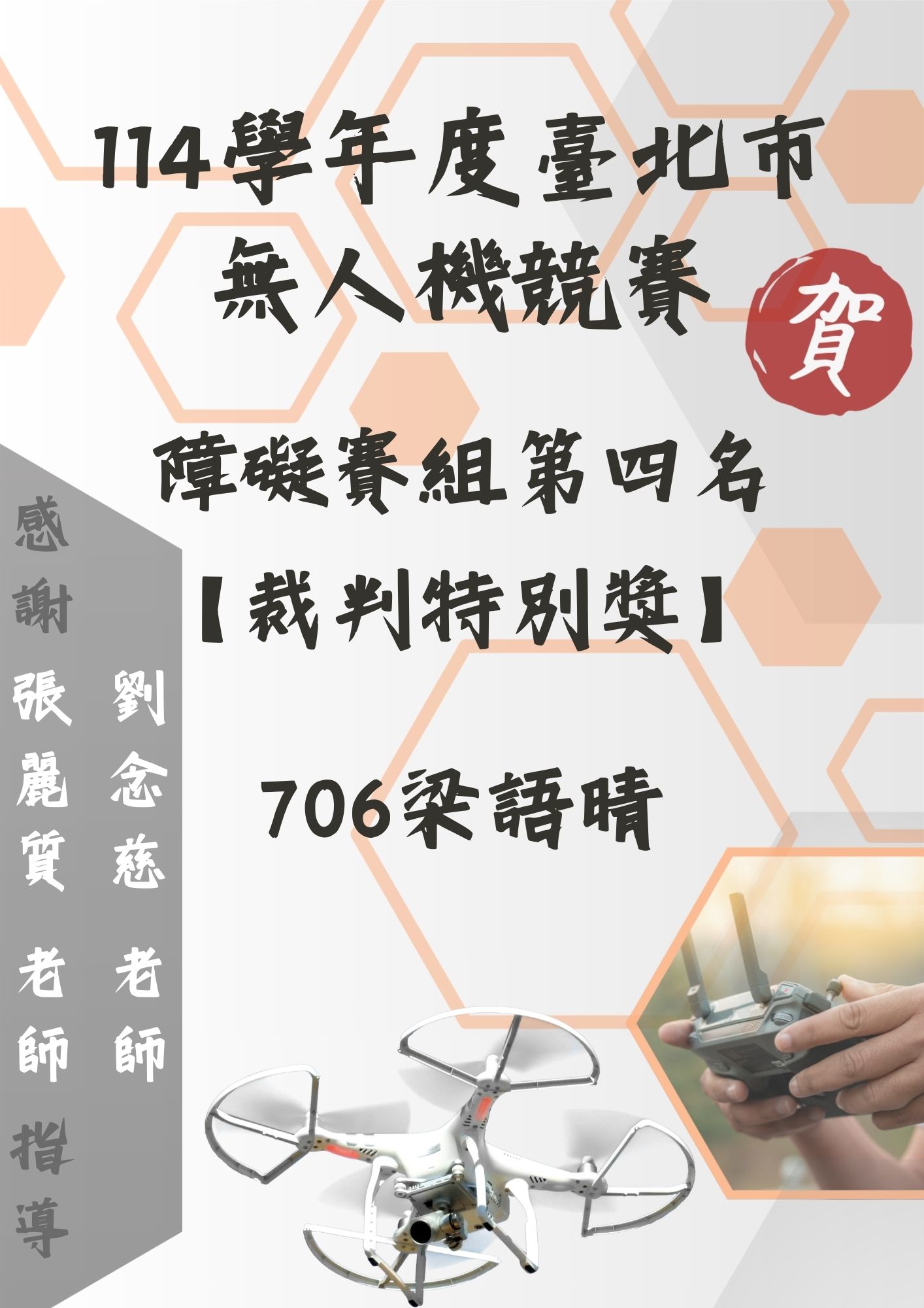 校園公告 公告主旨 114學年度臺北市無人機競賽障礙賽組第四名【裁判特別獎】 發佈日期 2025 年 12 月 08 日 發佈單位 訓育組 公告類別 最新訊息, 榮譽榜 公告等級 狂賀 點閱次數 336 公告內容 恭賀本校706梁語晴、703張詠程同學 榮獲114學年度臺北市無人機競賽障礙賽組第四名【裁判特別獎】 感謝本校張麗質老師、本校社團教師劉念慈老師共同指導!! 相關附件 114學年度臺北市無人機競賽得獎海報 114學年度臺北市無人機競賽得獎海報 檔案名稱檔案大小檔案格式下載114學年度臺北市無人機競賽得獎海報.jpg234.74 KB新視窗開啟檔案LINE_ALBUM_114無人機社_251208_1.jpg133.71 KB新視窗開啟檔案 114學年度臺北市無人機競賽得獎海報.jpgLINE_ALBUM_114無人機社_251208_1.jpg LINE_ALBUM_114無人機社_251208_4 LINE_ALBUM_114無人機社_251208_4 檔案名稱檔案大小檔案格式下載LINE_ALBUM_114無人機社_251208_4.jpg154.43 KB新視窗開啟檔案LINE_ALBUM_114無人機社_251208_3.jpg156.09 KB新視窗開啟檔案 LINE_ALBUM_114無人機社_251208_4.jpgLINE_ALBUM_114無人機社_251208_3.jpg 無人機02 無人機02 檔案名稱檔案大小檔案格式下載無人機02.jpg206.84 KB新視窗開啟檔案 無人機02.jpg 【2025-12-08】懷恩學校財團法人桃園市路亞國際高級中等學校115學年度IBDP課程 ... 【2025-12-08】變更「臺北市115學年度國際交換學生學習實施計畫」 市級複選英語 ...