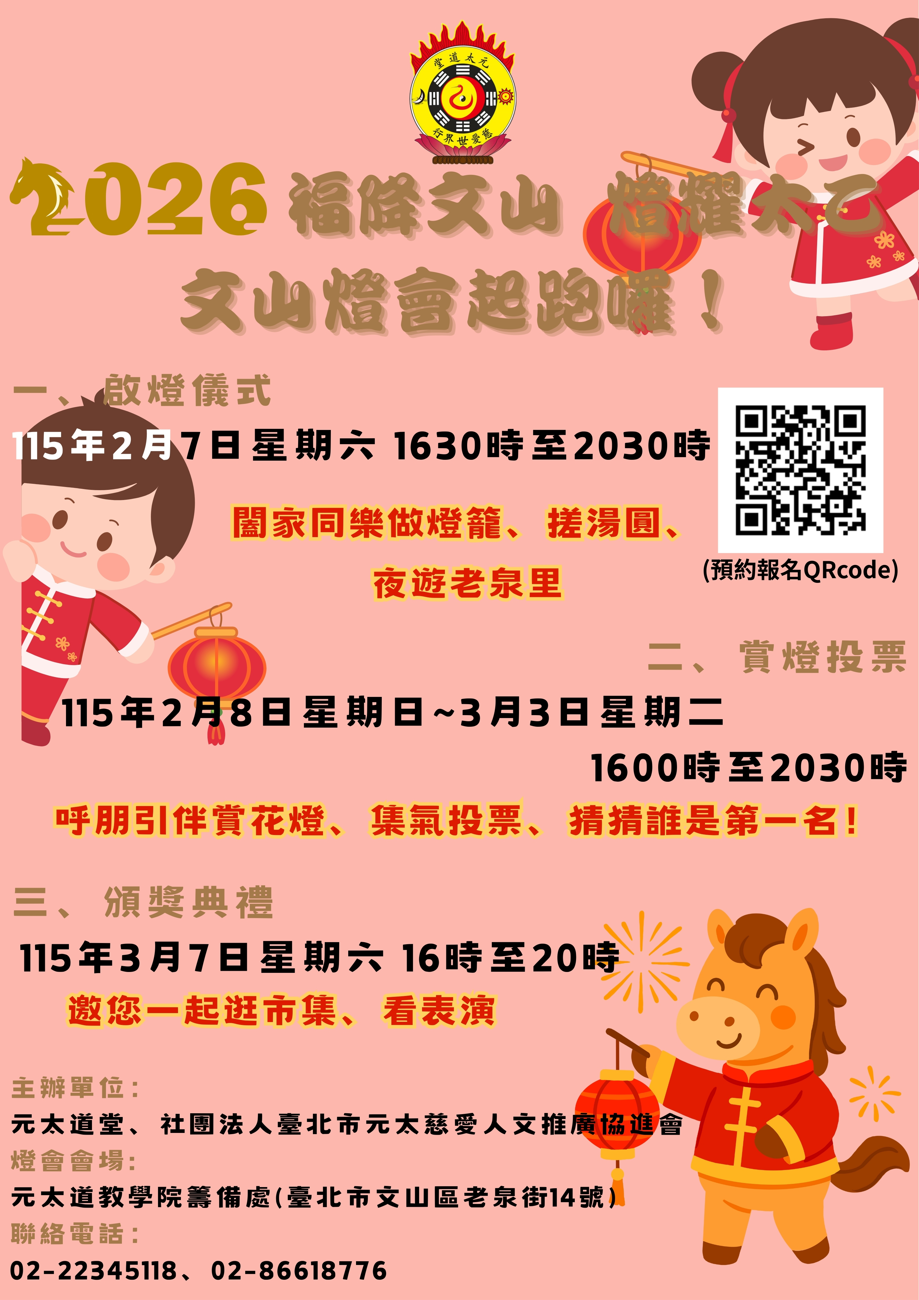| 公告主旨 | 函轉社團法人臺北市元太慈愛人文推廣協進會辦理2026 「福降文山,燈耀太乙」燈會暨燈籠彩繪比賽 |