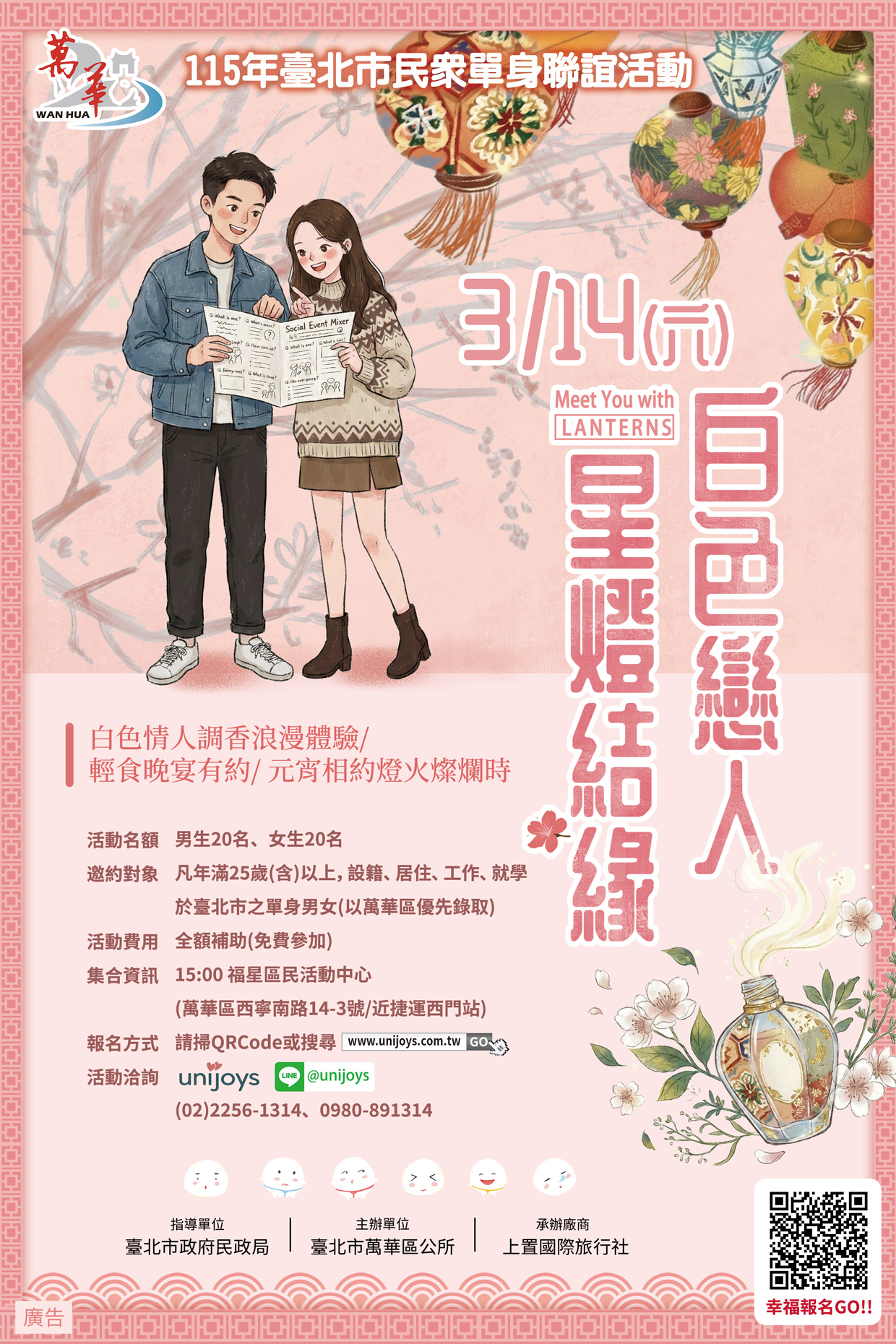 | 公告主旨 | 為辦理115年度萬華區公所單身聯誼活動「白色戀人星燈結緣」,請查照。 |