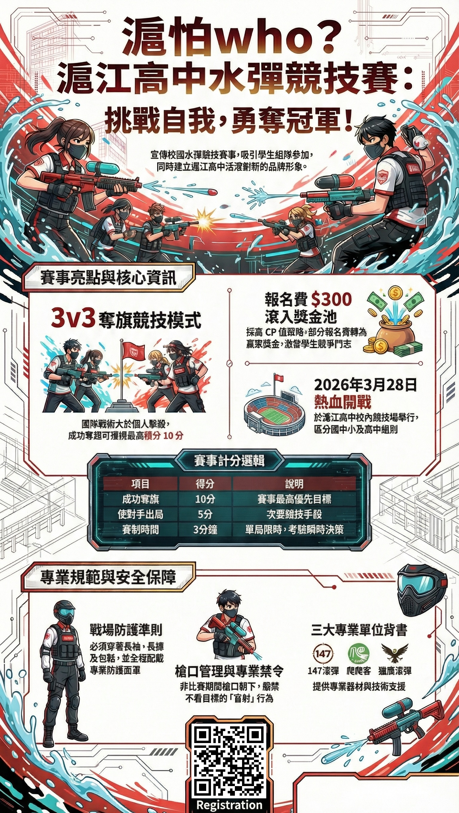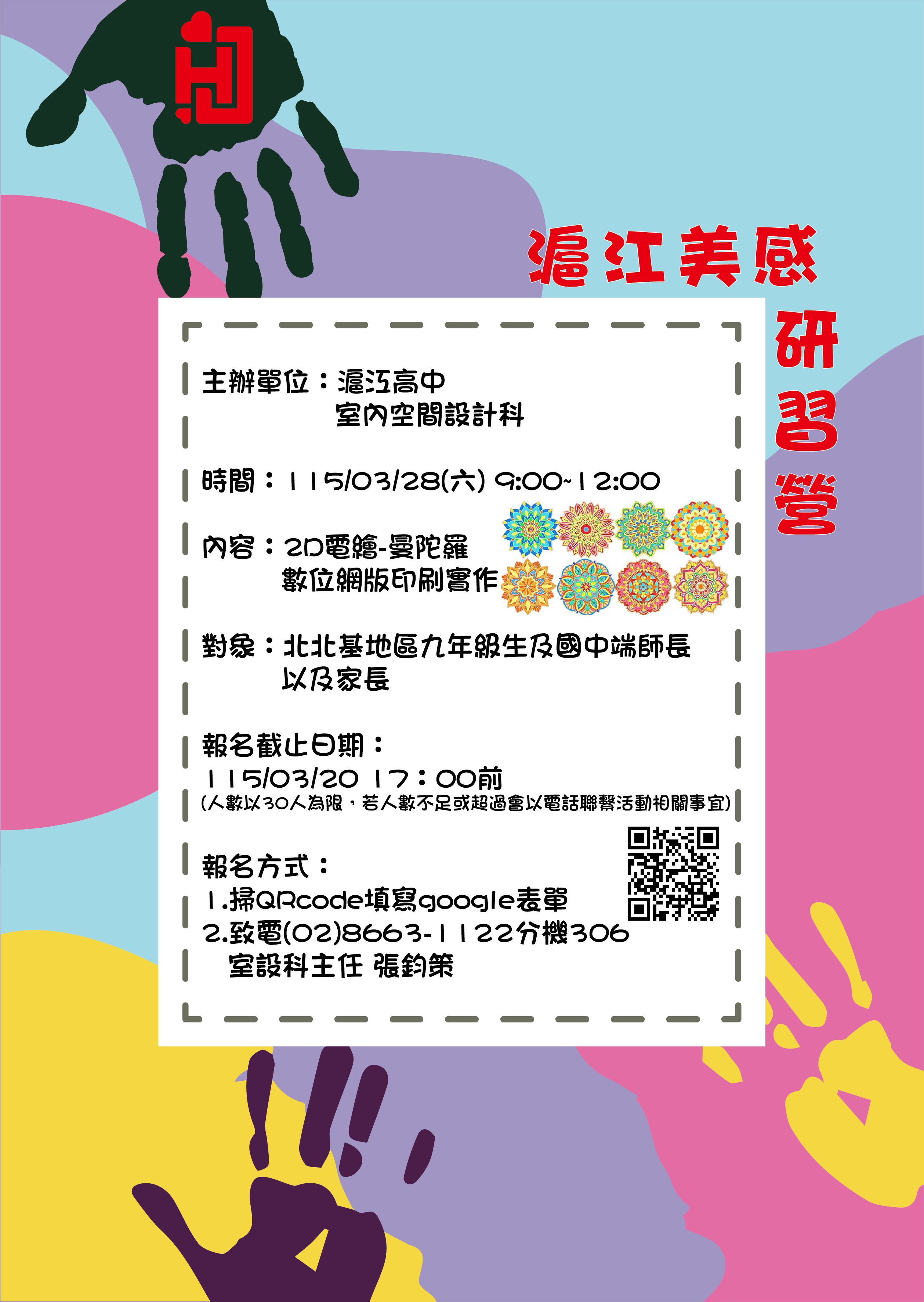 | 公告內容 | 一、 為協助國中學生探索設計職群發展,本校室內空間設計科規劃**「2D電繪曼陀羅」**體驗課程,運用 Adobe Illustrator 軟體引導學生從基礎「點、線、面」出發, 二、 活動當日適逢本校櫻花祭,校園備有多項精彩活動,誠邀 貴校親師生共同參與:【專業體驗】 包含室內空間設計科電繪課程、餐飲管理科「廚藝星工廠」實作。【熱血競技】 辦理「滬怕WHO」水彈賽,提供安全刺激的動態對抗體驗。【美感生活】 設置櫻花樹下二手市場尋寶區及野餐區,感受浪漫校園氛圍。 三、 活動資訊: 時間: 115 年 3 月28 日(星期六)09:00 – 12:00。 地點: 臺北市私立滬江高中(臺北市文山區羅斯福路六段142巷1號)。 報名:請掃描海報 QR Code 或連結 Google 表單https://forms.gle/CuEidLNZm9J3rFoB6報名。 |