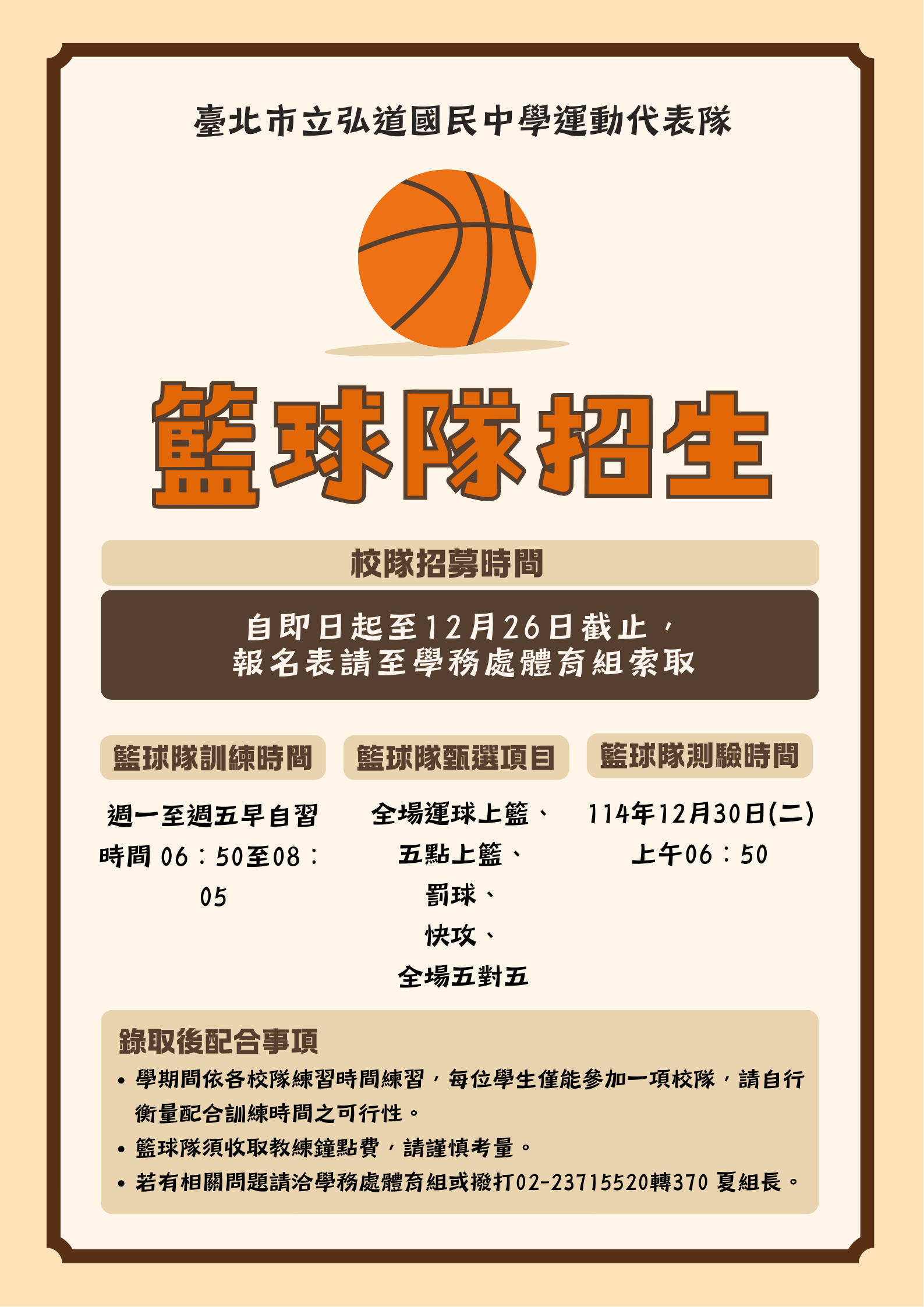 校園公告 公告主旨 本校114學年度籃球隊第2次招生甄選 發佈日期 2025 年 12 月 23 日 發佈單位 體育組 公告類別 最新訊息 公告等級 無 點閱次數 313 公告內容 相關附件 臺北市立弘道國民中學114學年度籃球隊第2次甄選同意書 臺北市立弘道國民中學114學年度籃球隊第2次甄選同意書 檔案名稱檔案大小檔案格式下載臺北市立弘道國民中學114學年度籃球隊第2次甄選同意書.pdf83.12 KB新視窗開啟檔案 臺北市立弘道國民中學114學年度籃球隊第2次甄選同意書.pdf 【2025-12-23】城市學校財團法人臺北城市科技大學辦理2026城市科大數媒系 動畫 ... 【2025-12-22】台北市教師研習中心115年教師活力希望課程~第1期「一點一世 界, ...