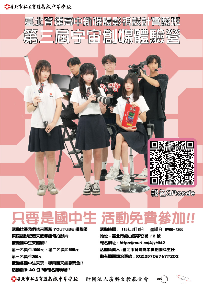 | 公告主旨 | 臺北市私立育達高中邀請貴校學生參加本校舉辦「第三屆宇宙創媒體驗營」,辦法如說明,敬請協助公告活動資訊並鼓勵學生參加。 |