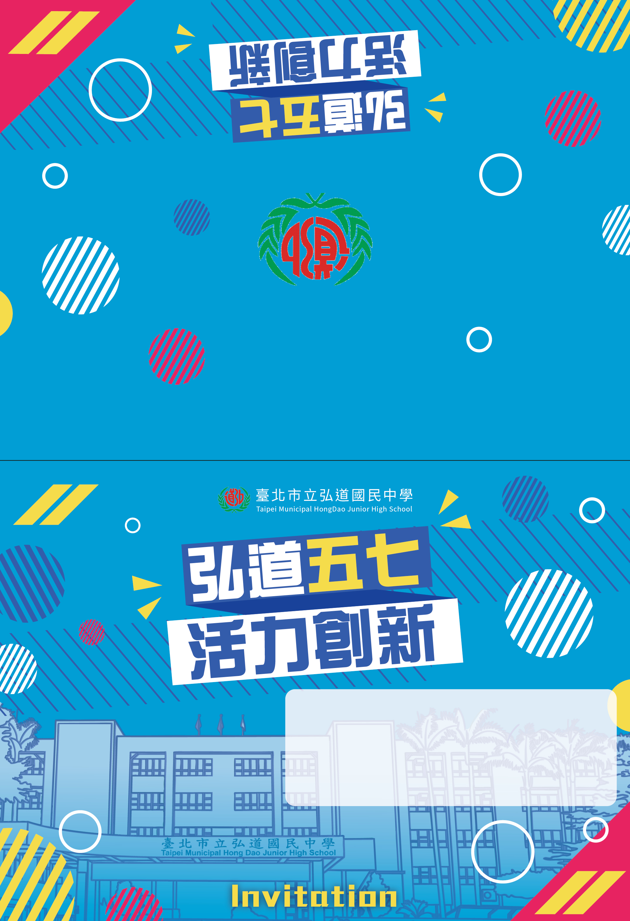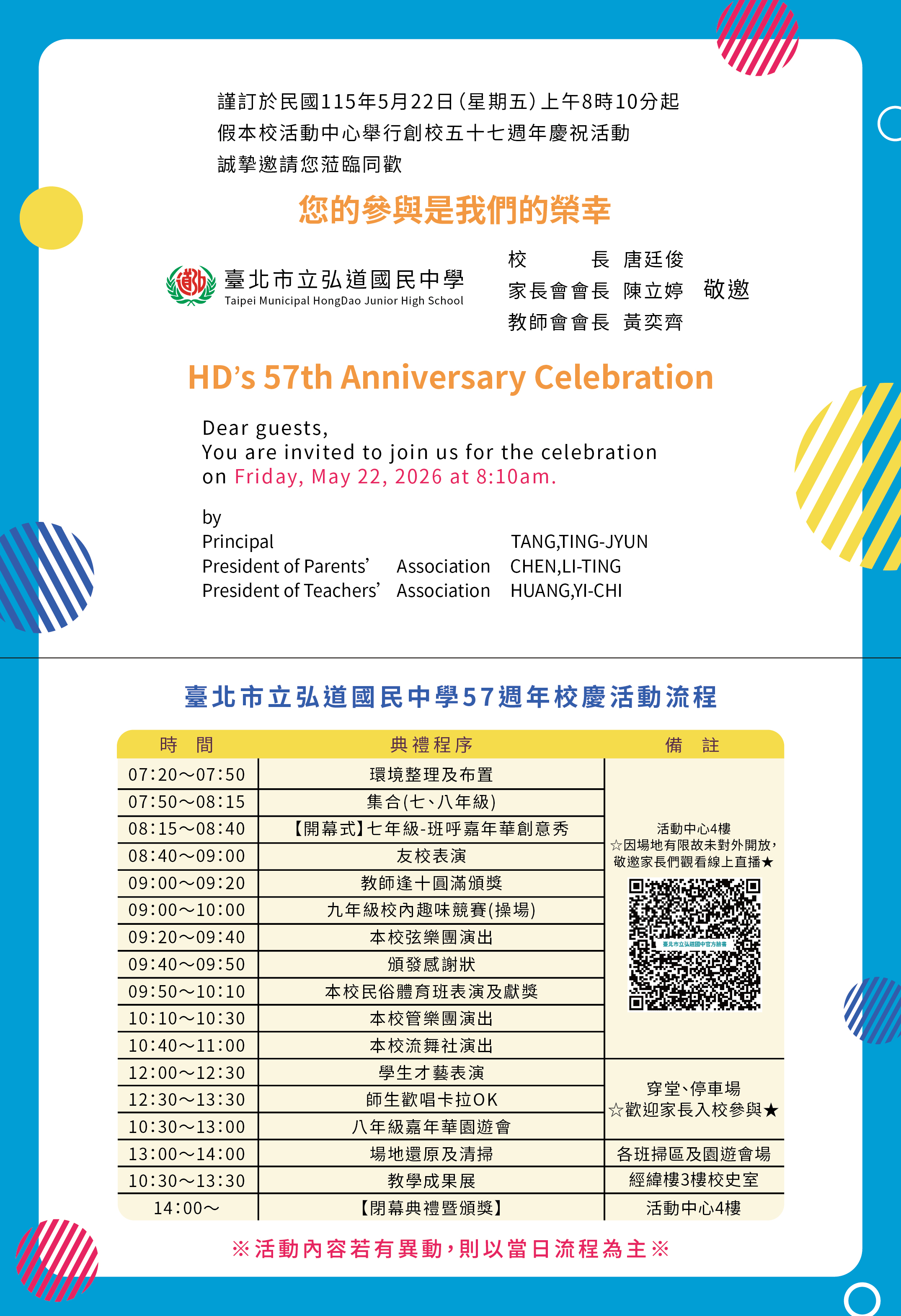 校園公告 公告主旨 臺北市立弘道國中57週年校慶(2026/5/22辦理) 發佈日期 2026 年 4 月 20 日 發佈單位 訓育組 公告類別 最新訊息 公告等級 無 點閱次數 312 公告內容 親愛的貴賓您們好: 1.今年本校8:00~11:00校慶慶祝大會改在活動中心4樓辦理,因場地有限故不開放家長參與,歡迎家長使用本校臉書觀看慶祝大會直播。(QR code如邀請卡所示) 2.10:30後歡迎家長們入校參與園遊會。 3.13:30將開始進行場復清潔及閉幕式(含頒獎),請家長們留意學生放學後的動向及返家時間。 【57校慶第49期電子校刊待出刊後將刊登於:https://reurl.cc/zQpvDe】 相關附件 邀請卡_封面 邀請卡_封面 檔案名稱檔案大小檔案格式下載邀請卡_封面.jpg2.36 MB新視窗開啟檔案邀請卡_內頁.jpg1.88 MB新視窗開啟檔案 邀請卡_封面.jpg邀請卡_內頁.jpg 相關連結 弘道電子校刊 【2026-04-21】臺北市立大安高級工業職業學校辦理「114學年度辦理國中學生家長 ... 【2026-04-20】2026夏令營-高中企管營(不過夜營隊),招生中!!