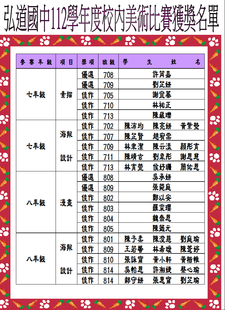 校園公告 公告主旨 112學年度第二學期校內美術比賽得獎名單 發佈日期 2024 年 3 月 14 日 發佈單位 教學組 公告類別 最新訊息, 榮譽榜, 活動與競賽 公告等級 賀 點閱次數 1,266 公告內容 相關附件 【2024-03-14】中正預校113學年度高(國)中部招生訊息 【2024-03-14】服務時數!「2024服務學習──攜手琪淨灘」服務學習活動