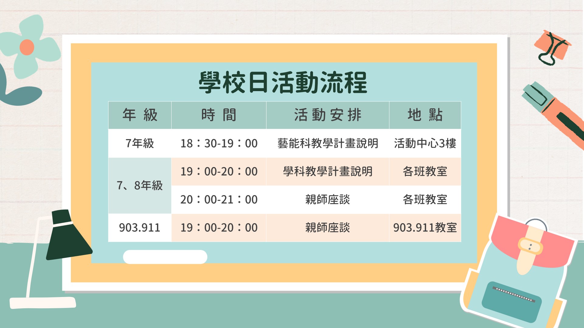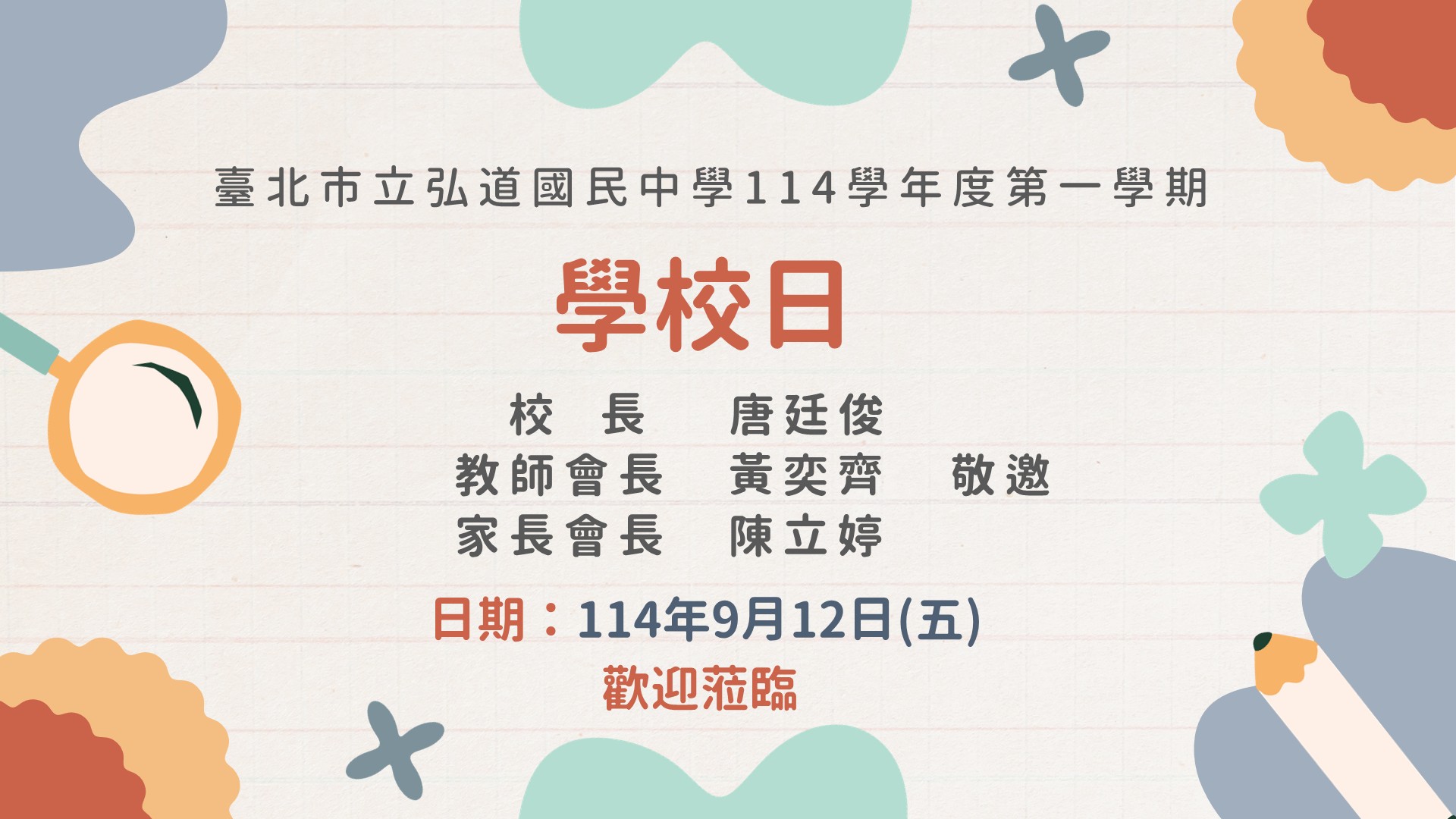 校園公告 公告主旨 114年9月12日(五)18:30-21:00為弘道國中114學年度第一學期學校日,歡迎家長蒞臨! 發佈日期 2025 年 9 月 11 日 發佈單位 輔導組 公告類別 最新訊息 公告等級 無 點閱次數 901 公告內容 相關附件 學校日流程 學校日流程 檔案名稱檔案大小檔案格式下載學校日邀請卡.JPG289.74 KB新視窗開啟檔案學校日流程.JPG232.52 KB新視窗開啟檔案 學校日邀請卡.JPG學校日流程.JPG 【2025-09-11】2026年臺灣國際科學展覽會國內學生報名 【2025-09-11】朱銘美術館北北基國中小專案「孩子們的藝術探索之旅」