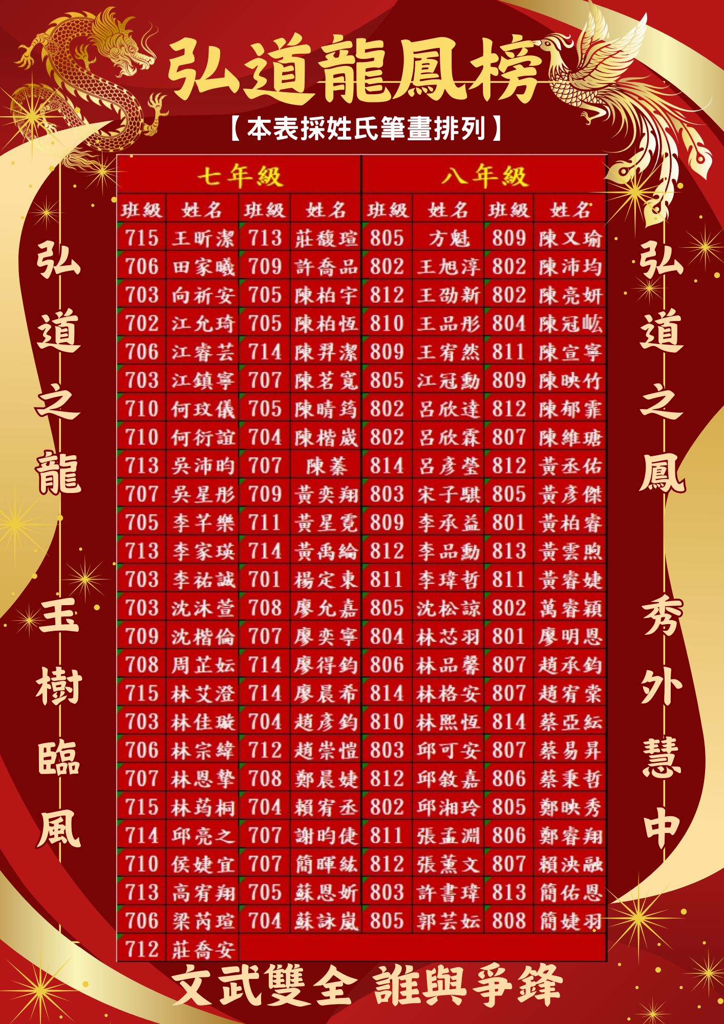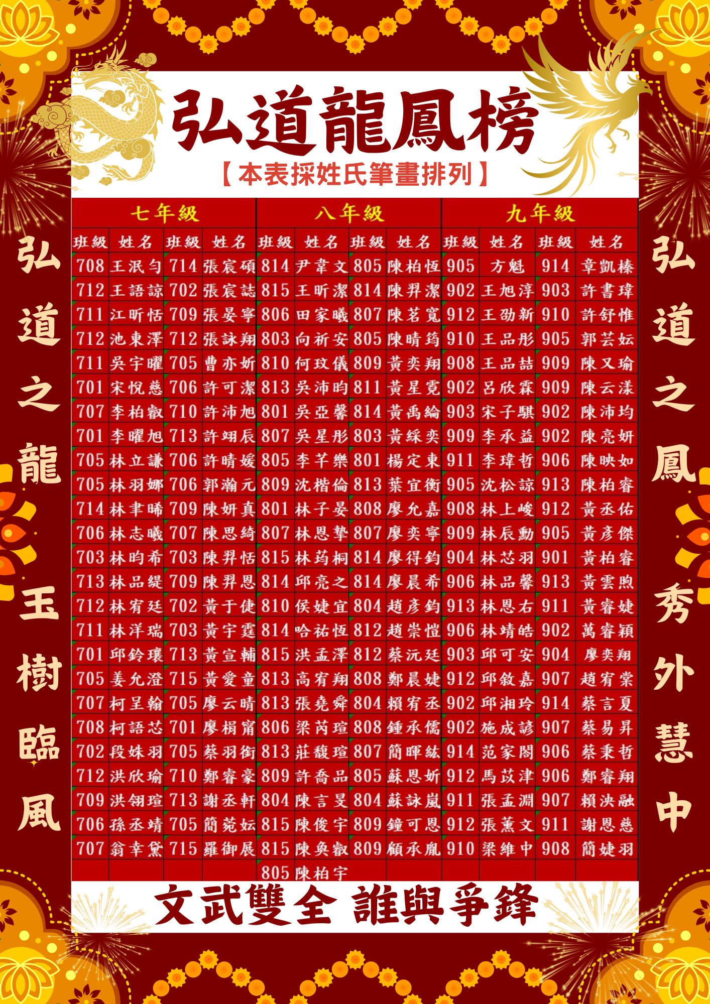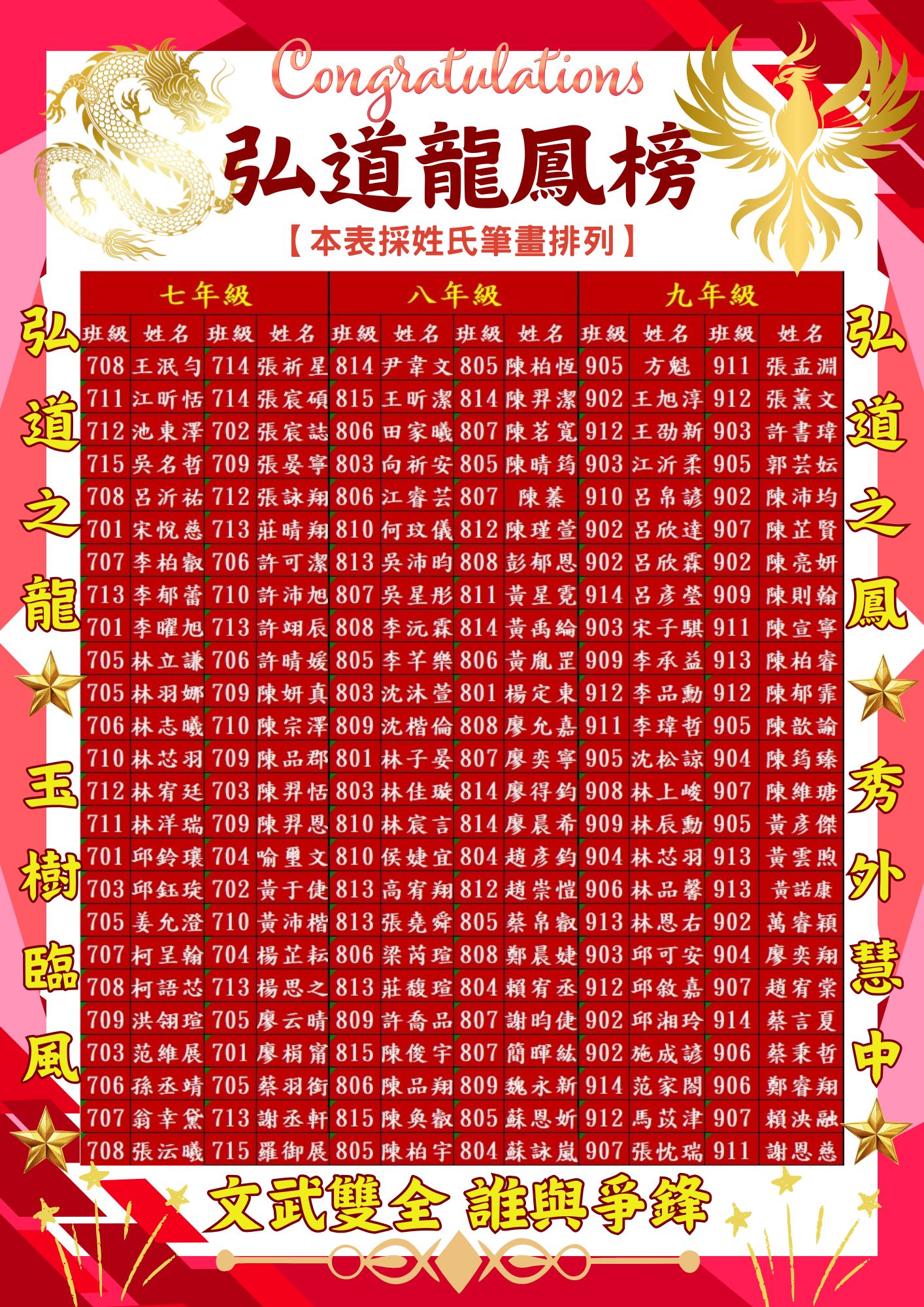 校園公告 公告主旨 龍鳳榜(含114-1七八九年級第二次定期考組距人數及各科組距) 發佈日期 2025 年 12 月 17 日 發佈單位 註冊組 公告類別 最新訊息, 榮譽榜, 註冊組 公告等級 無 點閱次數 46,295 公告內容 114-1七、八、九年級第二次定期考 114-01-N02各科組距 114-01-N02各科組距 檔案名稱檔案大小檔案格式下載114-01-N02各科組距.pdf56.57 KB新視窗開啟檔案 114-01-N02各科組距.pdf 114-1 七八九年級第二次定考組距人數 114-1 七八九年級第二次定考組距人數 檔案名稱檔案大小檔案格式下載114-1 七八九年級第二次定考組距人數.xls31.50 KB新視窗開啟檔案 114-1 七八九年級第二次定考組距人數.xls 114-1七、八、九年級第一次定期考 114-1 七八九年級第一次定考組距人數 114-1 七八九年級第一次定考組距人數 檔案名稱檔案大小檔案格式下載114-1 七八九年級第一次定考組距人數.xls31.50 KB新視窗開啟檔案 114-1 七八九年級第一次定考組距人數.xls 114-01-N01各科組距(更新) 114-01-N01各科組距(更新) 檔案名稱檔案大小檔案格式下載114-01-N01各科組距(更新).pdf54.91 KB新視窗開啟檔案 114-01-N01各科組距(更新).pdf14:10更新 113-2七、八年級第三次定期考 113-2 7.8年級第三次定考組距人數 113-2 7.8年級第三次定考組距人數 檔案名稱檔案大小檔案格式下載113-2 7.8年級第三次定考組距人數.xls31.50 KB新視窗開啟檔案 113-2 7.8年級第三次定考組距人數.xls 113-02-N03各科組距 113-02-N03各科組距 檔案名稱檔案大小檔案格式下載113-02-N03各科組距.pdf46.02 KB新視窗開啟檔案 113-02-N03各科組距.pdf 113-2七、八年級第二次定期考 113-02-N02各科組距 113-02-N02各科組距 檔案名稱檔案大小檔案格式下載113-02-N02各科組距.pdf46.52 KB新視窗開啟檔案 113-02-N02各科組距.pdf 113-2 7.8年級第二次定考組距人數 113-2 7.8年級第二次定考組距人數 檔案名稱檔案大小檔案格式下載113-2 7.8年級第二次定考組距人數.xls31.50 KB新視窗開啟檔案 113-2 7.8年級第二次定考組距人數.xls 113-2九年級第一次定期考 113-02-N03-9年級各科組距 113-02-N03-9年級各科組距 檔案名稱檔案大小檔案格式下載113-02-N03-9年級各科組距.pdf38.04 KB新視窗開啟檔案 113-02-N03-9年級各科組距.pdf 113-2九年級第一次定考組距人數 113-2九年級第一次定考組距人數 檔案名稱檔案大小檔案格式下載113-2九年級第一次定考組距人數.xls31.00 KB新視窗開啟檔案 113-2九年級第一次定考組距人數.xls 113-2七八年級第一次定期考 (0418更新)113-02-N01各科組距 (0418更新)113-02-N01各科組距 檔案名稱檔案大小檔案格式下載(0418更新)113-02-N01各科組距.pdf46.59 KB新視窗開啟檔案 (0418更新)113-02-N01各科組距.pdf 113-2 7.8年級第一次定考組距人數 113-2 7.8年級第一次定考組距人數 檔案名稱檔案大小檔案格式下載113-2 7.8年級第一次定考組距人數.xls檔案不存在 !!新視窗開啟檔案 113-2 7.8年級第一次定考組距人數.xls 113-1第三次定期考 113-01-N03各科組距(公告) 113-01-N03各科組距(公告) 檔案名稱檔案大小檔案格式下載113-01-N03各科組距(公告).pdf55.94 KB新視窗開啟檔案 113-01-N03各科組距(公告).pdf 113-1 七八九年級第三次定考組距人數(公告) 113-1 七八九年級第三次定考組距人數(公告) 檔案名稱檔案大小檔案格式下載113-1 七八九年級第三次定考組距人數(公告).xls31.50 KB新視窗開啟檔案 113-1 七八九年級第三次定考組距人數(公告).xls 113-1第二次定期考(龍鳳榜12/20於17:00更新) 113-1 七八九年級第二次定考組距人數 113-1 七八九年級第二次定考組距人數 檔案名稱檔案大小檔案格式下載113-1 七八九年級第二次定考組距人數.xls31.50 KB新視窗開啟檔案 113-1 七八九年級第二次定考組距人數.xls 113-1第一次定期考 七、八、九年級龍鳳榜、組距人數及各科組距(1104新增) 113-1 七八九年級第一次定考組距人數 113-1 七八九年級第一次定考組距人數 檔案名稱檔案大小檔案格式下載113-1 七八九年級第一次定考組距人數.xls31.50 KB新視窗開啟檔案 113-1 七八九年級第一次定考組距人數.xls 113-01-N01各科組距 113-01-N01各科組距 檔案名稱檔案大小檔案格式下載113-01-N01各科組距.pdf55.70 KB新視窗開啟檔案 113-01-N01各科組距.pdf 112-2第三次定期考 七、八年級龍鳳榜、組距人數、各科組距 112-2七八年級第三次定考龍鳳榜 112-2七八年級第三次定考龍鳳榜 檔案名稱檔案大小檔案格式下載112-2七八年級第三次定考龍鳳榜.xls58.50 KB新視窗開啟檔案 112-2七八年級第三次定考龍鳳榜.xls 112-2-3-七、八年級各科組距 112-2-3-七、八年級各科組距 檔案名稱檔案大小檔案格式下載112-2-3-七、八年級各科組距.pdf46.28 KB新視窗開啟檔案 112-2-3-七、八年級各科組距.pdf 112-2 7.8年級第三次定考組距人數 112-2 7.8年級第三次定考組距人數 檔案名稱檔案大小檔案格式下載112-2 7.8年級第三次定考組距人數.xls31.50 KB新視窗開啟檔案 112-2 7.8年級第三次定考組距人數.xls(18:30更新) 112-2第二次定考 各年級九年級龍鳳榜、組距人數、各科組距 112-2七八年級第二次定考龍鳳榜 112-2七八年級第二次定考龍鳳榜 檔案名稱檔案大小檔案格式下載112-2七八年級第二次定考龍鳳榜.xls62.50 KB新視窗開啟檔案 112-2七八年級第二次定考龍鳳榜.xls 112-02-N02各科組距 112-02-N02各科組距 檔案名稱檔案大小檔案格式下載112-02-N02各科組距.pdf45.89 KB新視窗開啟檔案 112-02-N02各科組距.pdf 112-2 7.8年級第二次定考組距人數 112-2 7.8年級第二次定考